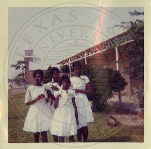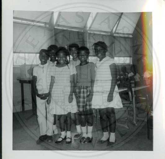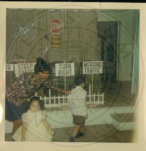 In Background a skit on Safety Church and Sherri Andrews are enjoying the thrills under Betty Wilson’s guidance, Douglass Auditorium; 3.5” x3.5”; color |