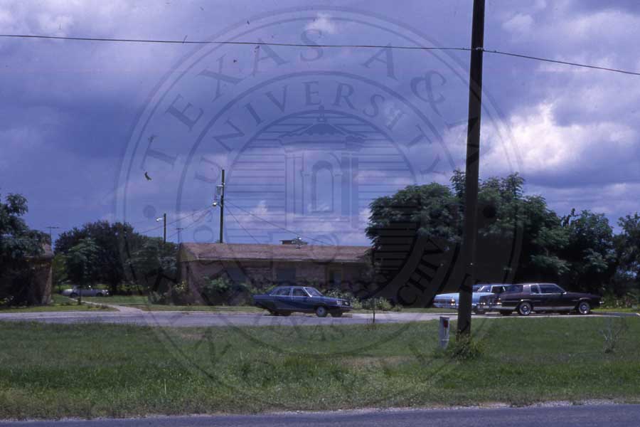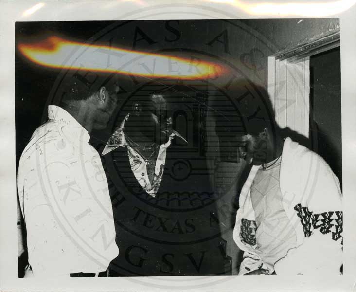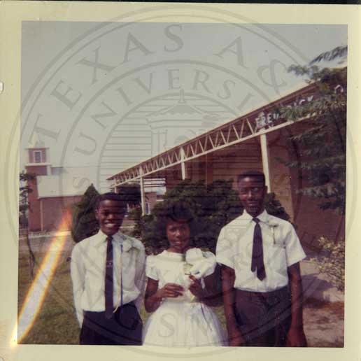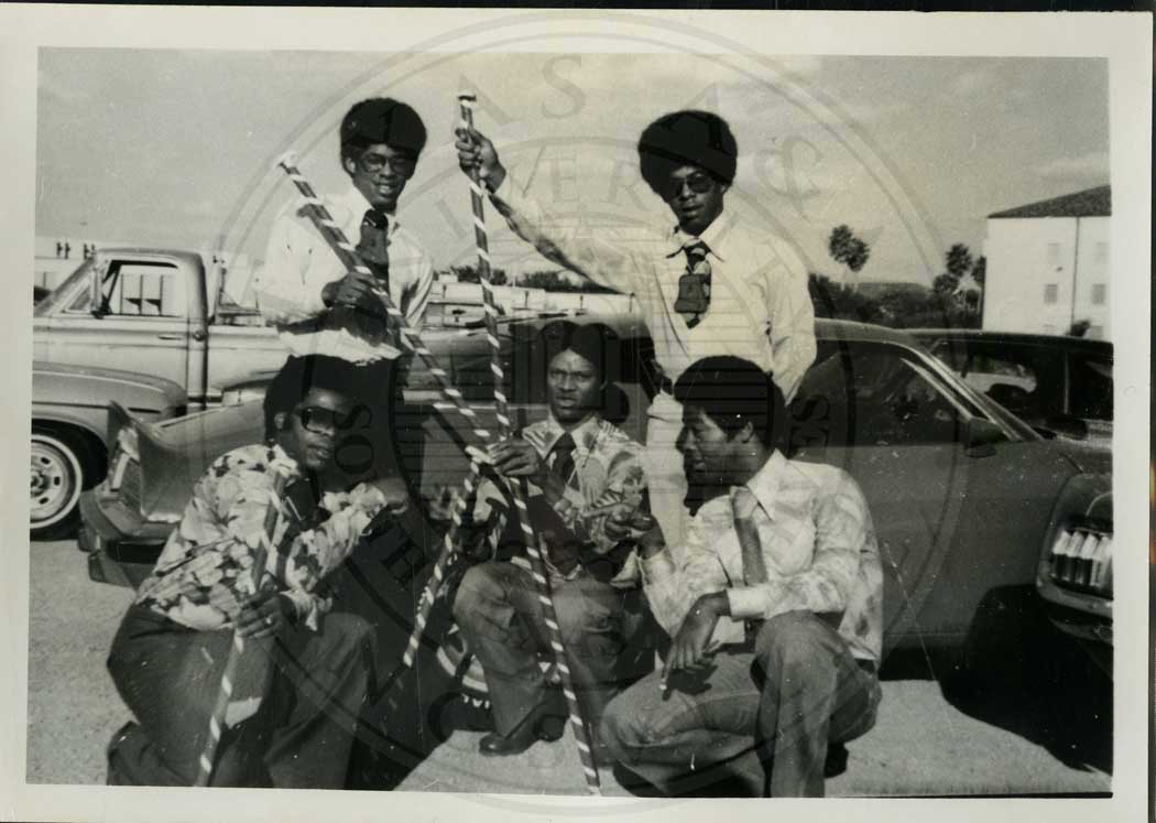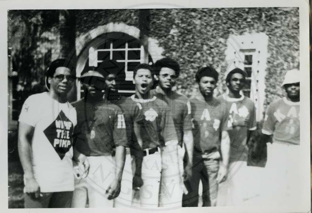 Eight unidentified young men posing for the picture outside the Memorial Student Union Building at A&I |