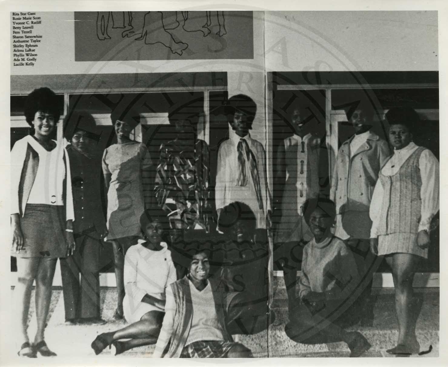 Rita Star Gant, Rosie Marie Scott, Yvonne C. Ratliff, Betty Leavell, Fern Terrell, Sharon Satterwhite, Arthurene Taylor, Shirley Ephram, Arlena LaRue, Phyllis Wilson, Ada M. Godly & Lucille Kelly posing for the picture outside a building |