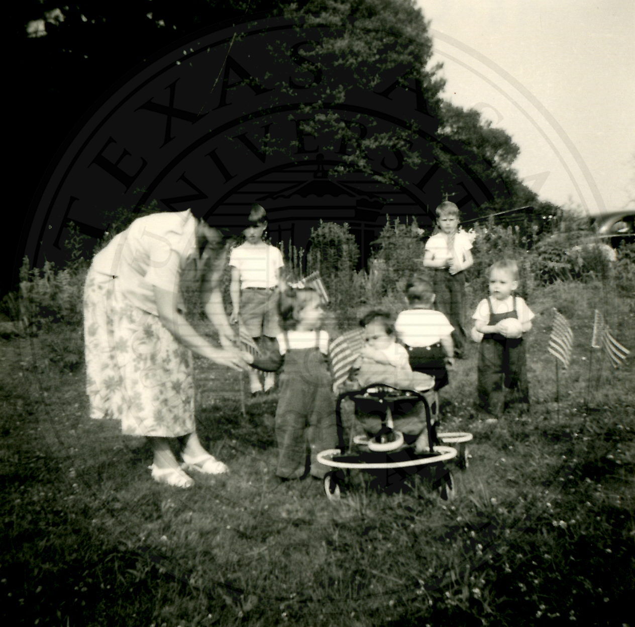 Unidentified woman bent over at the waist over an unidentified girl toddler. There are five more unidentified boys and girls |