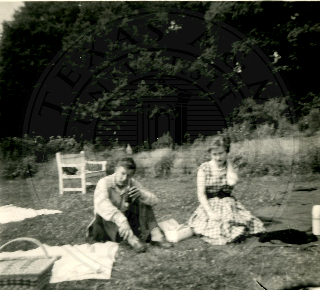 An unidentified man and woman seated on the ground with a picnic blanket next to them on the left |