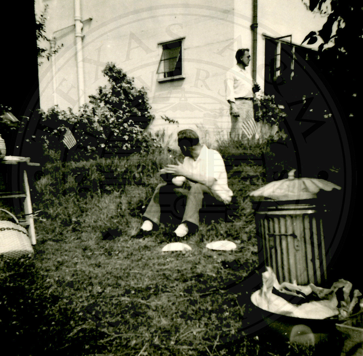 Two unidentified men on the right side of the photo, one is seated and holding a plate of food looking over his shoulder. The other man standing in the background leaning up against a wall. A trash can is on the right foreground |
