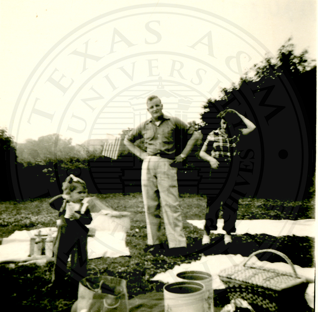 An unidentifed man, woman, and girl toddler standing in the middle of three picnic blankets and a picnic basket in the foreground |