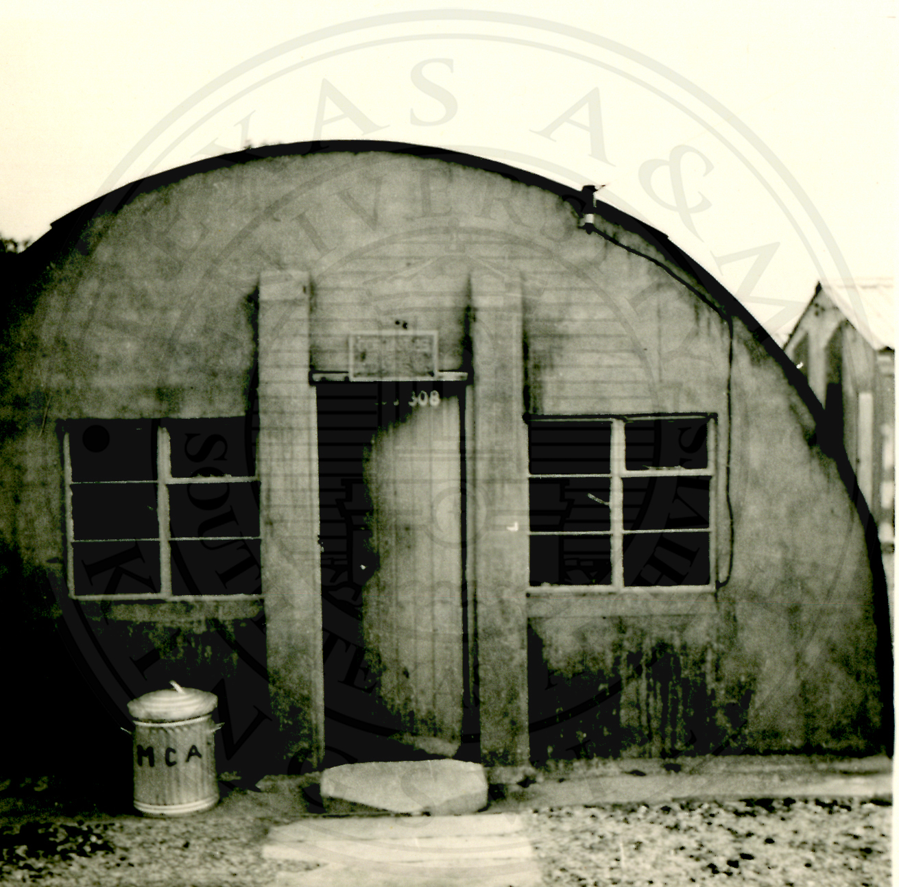 Unidentified military barrack with a trash can with M.C.A. stenciled on it |