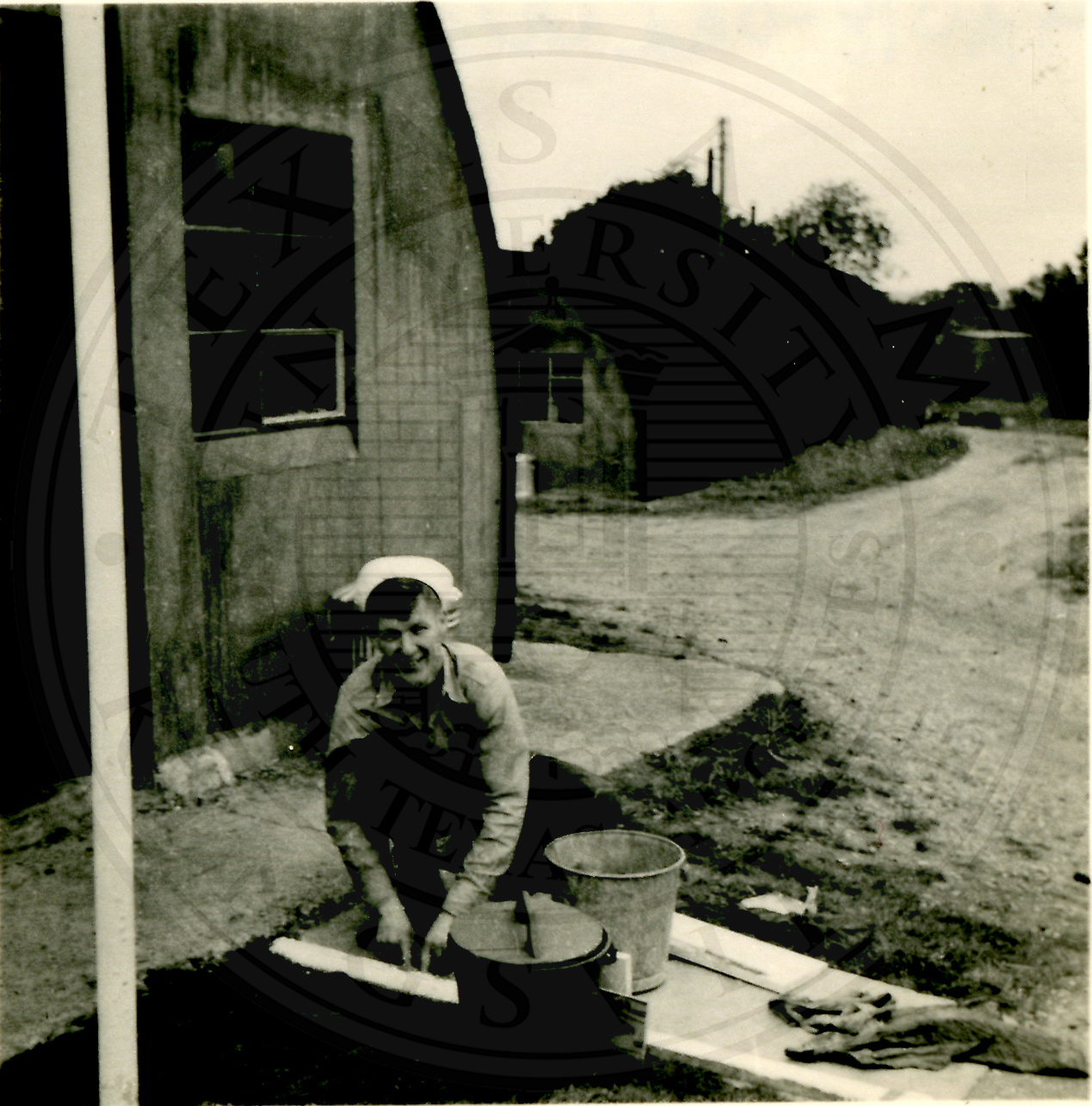 Unidentified sailor kneeling outside between barrack and street. Looks like he is building a side walk |