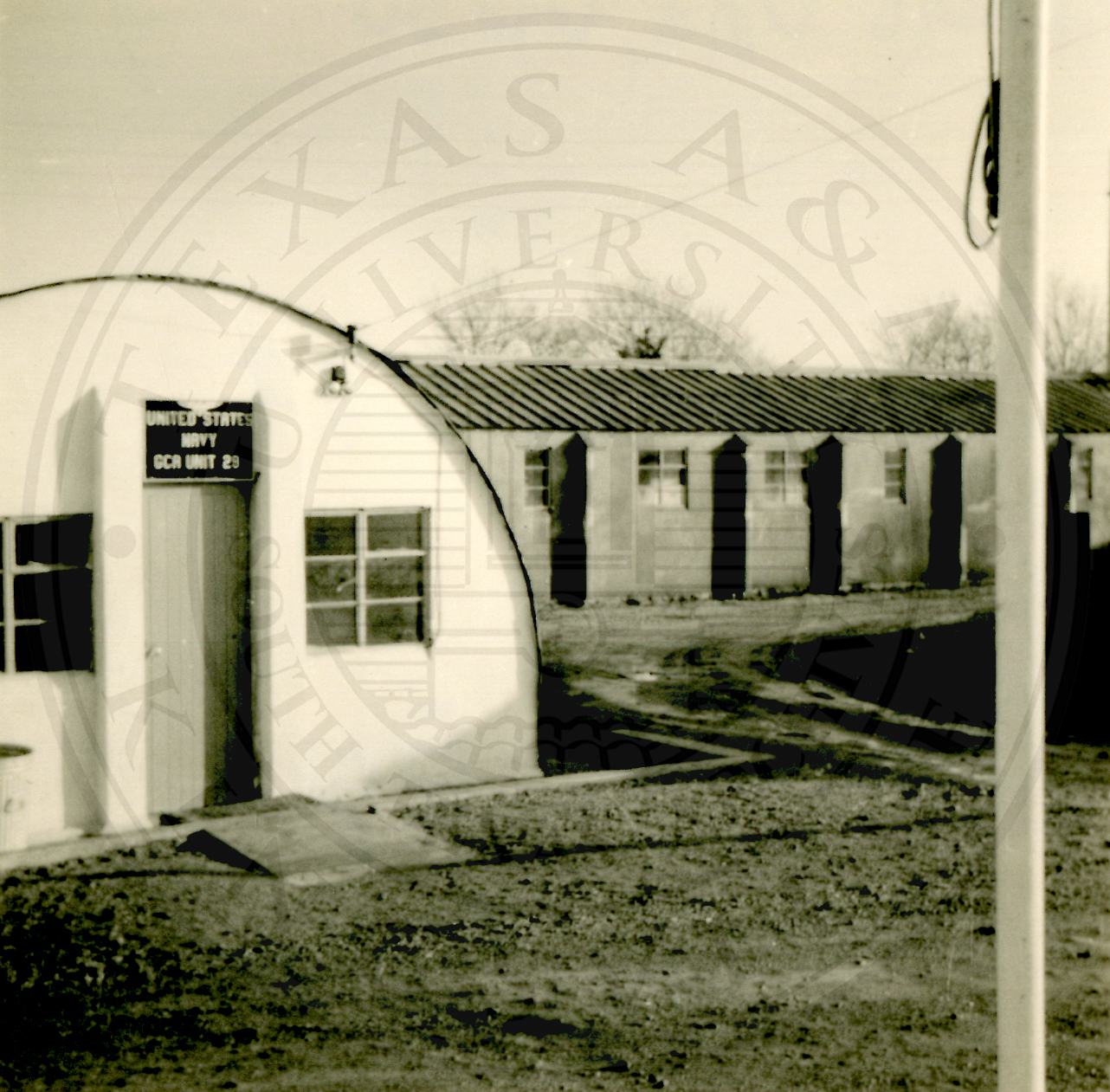 Barrack with a sign that reads "Unites States Navy GCA Unit 19" |