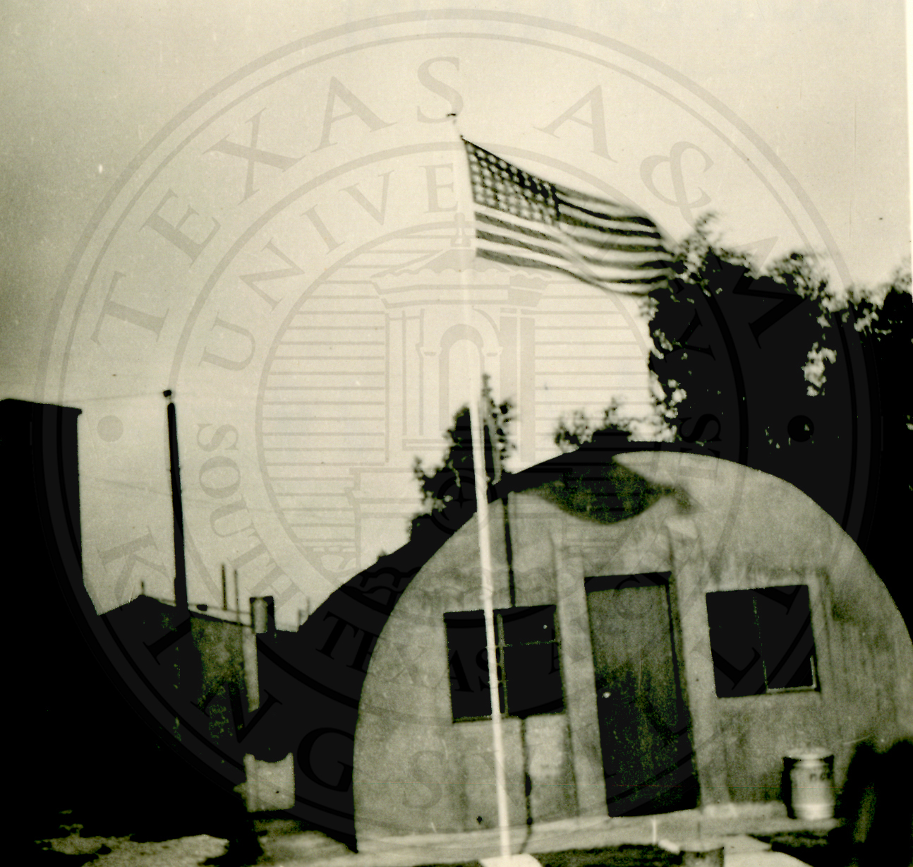 Unidentified barrack with an American flag flying outside |