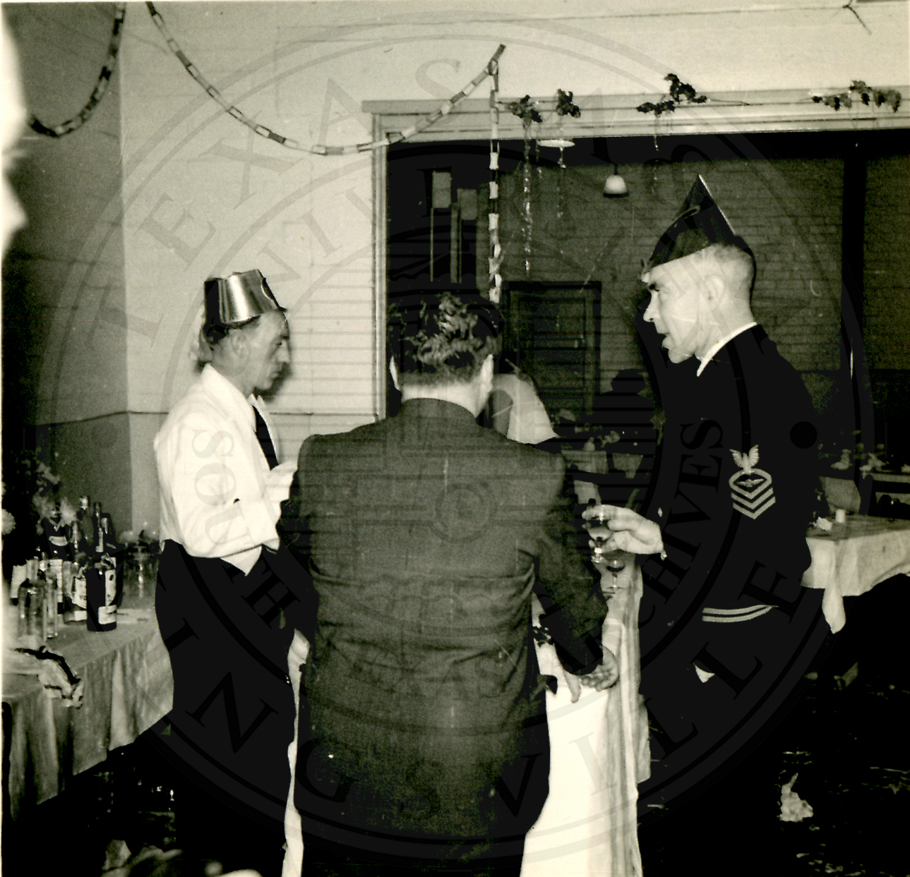 New Years Eve. Three unidentified men standing. The man on the left is in a shirt, tie, and hat. The man in the middle has his back turned to the camera and standing next to him on the right is a man in a Navy Dress Uniform |