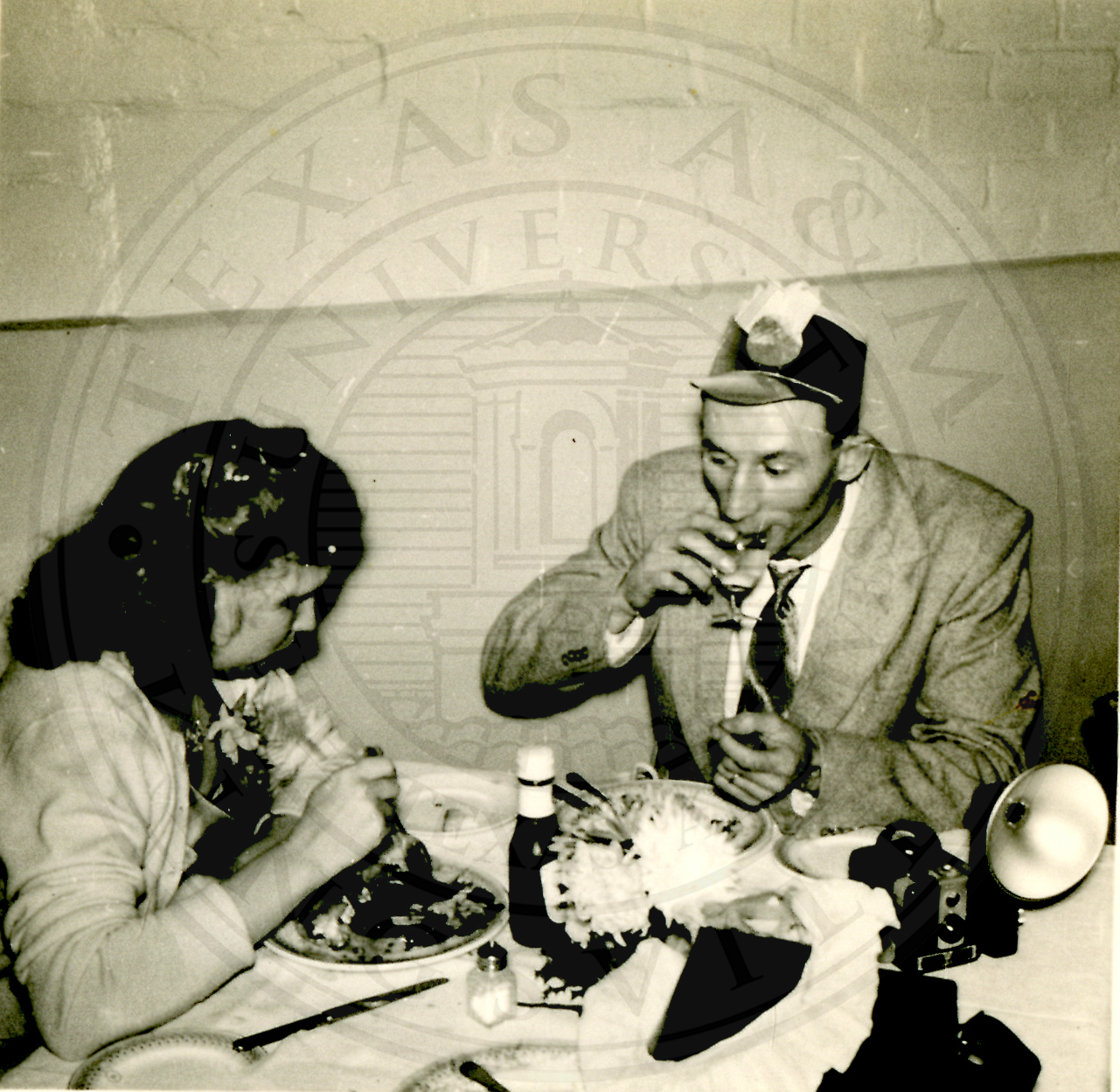 New Years Eve. Unidentified (L-R) woman and man sitting at a table. The woman has food in front of her and the man is drinking. A camera is on the table |