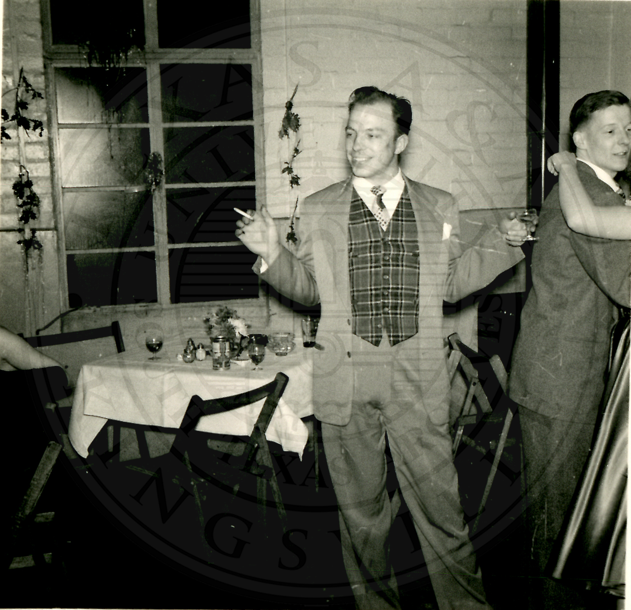 New Years Eve. Unidentified man wearing a three piece suit, a cigarette in his right hand and a champagne glass in his left |