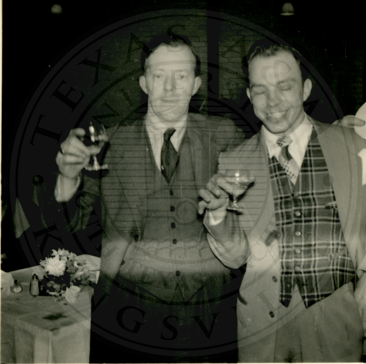 New Years Eve. Two unidentified men wearing three piece suits. Both men are holding a champagne glass in their right hands but the man on the right has his eyes closed and a wide grin |