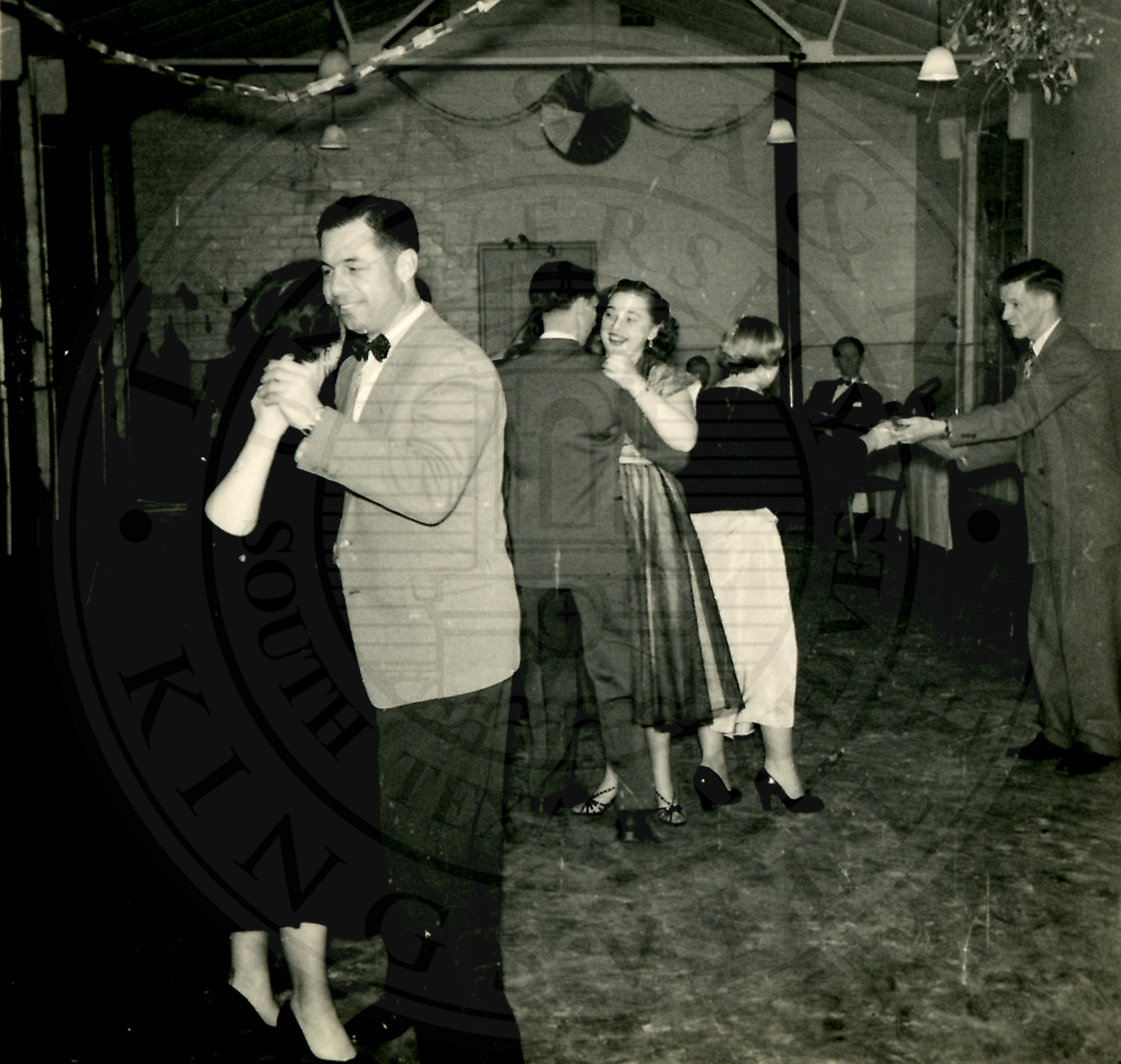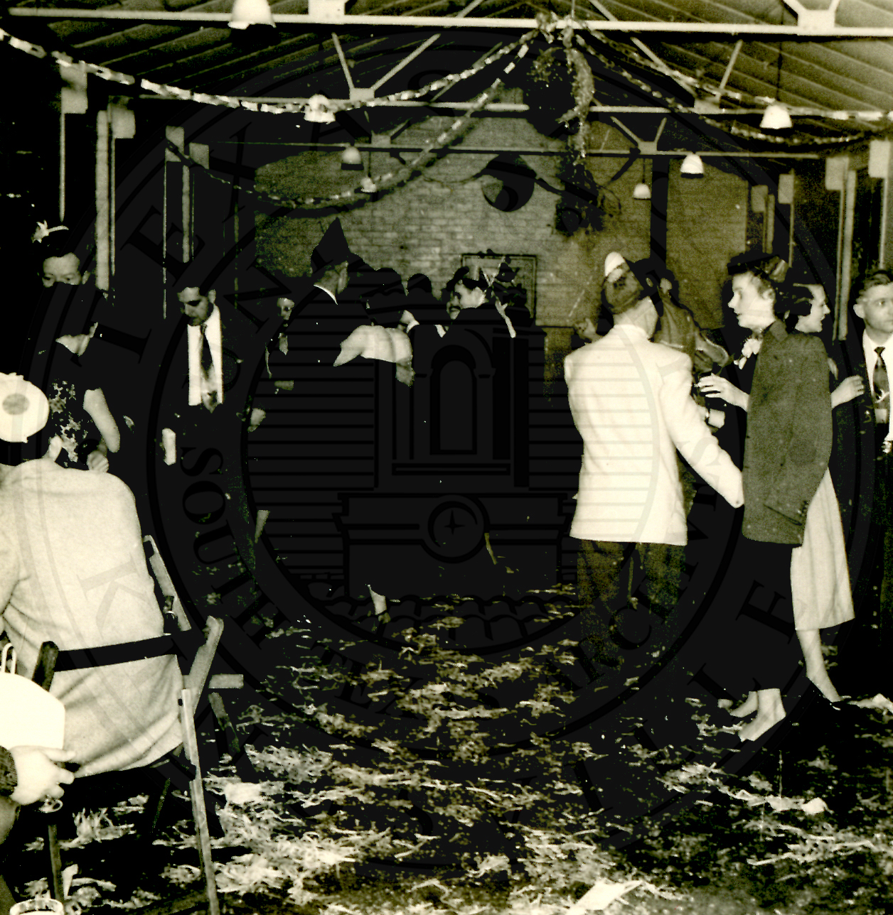 New Years Eve. Several unidentified men and women dancing. Confetti and streamers litter the floor |