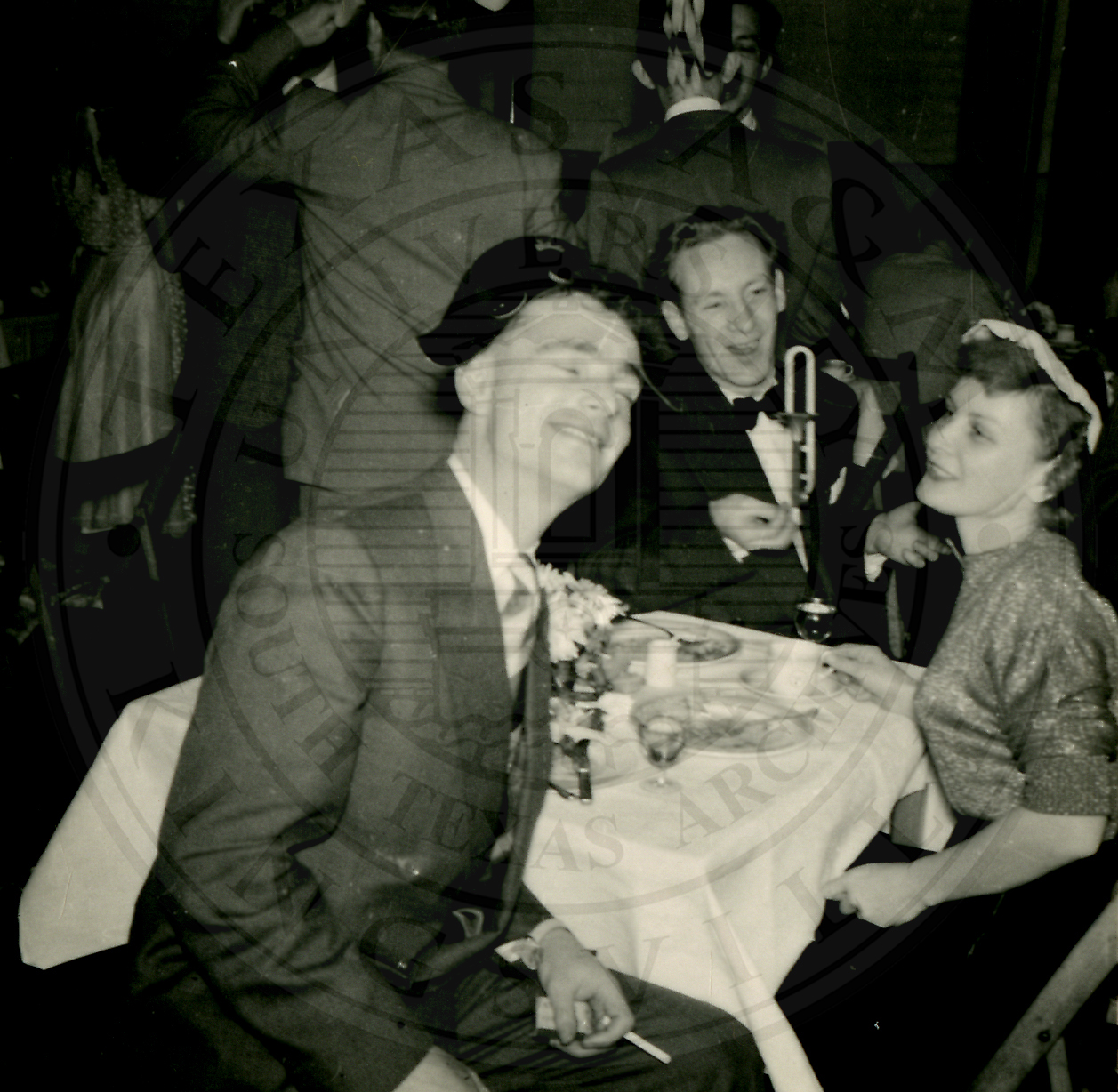New Years Eve. Two unidentified men sitting at a table, one in frnt of the camera and the other on the other side. An unidentified woman is also seated at the table on the right |