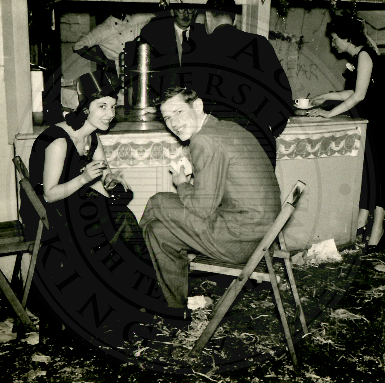 New Years Eve. Two unidentidied men (L-R) sitting turning to face the camera and the other one has his back to the camera. In the background an unidentified woman is seated next to an unidentified man with his head on her shoulder |