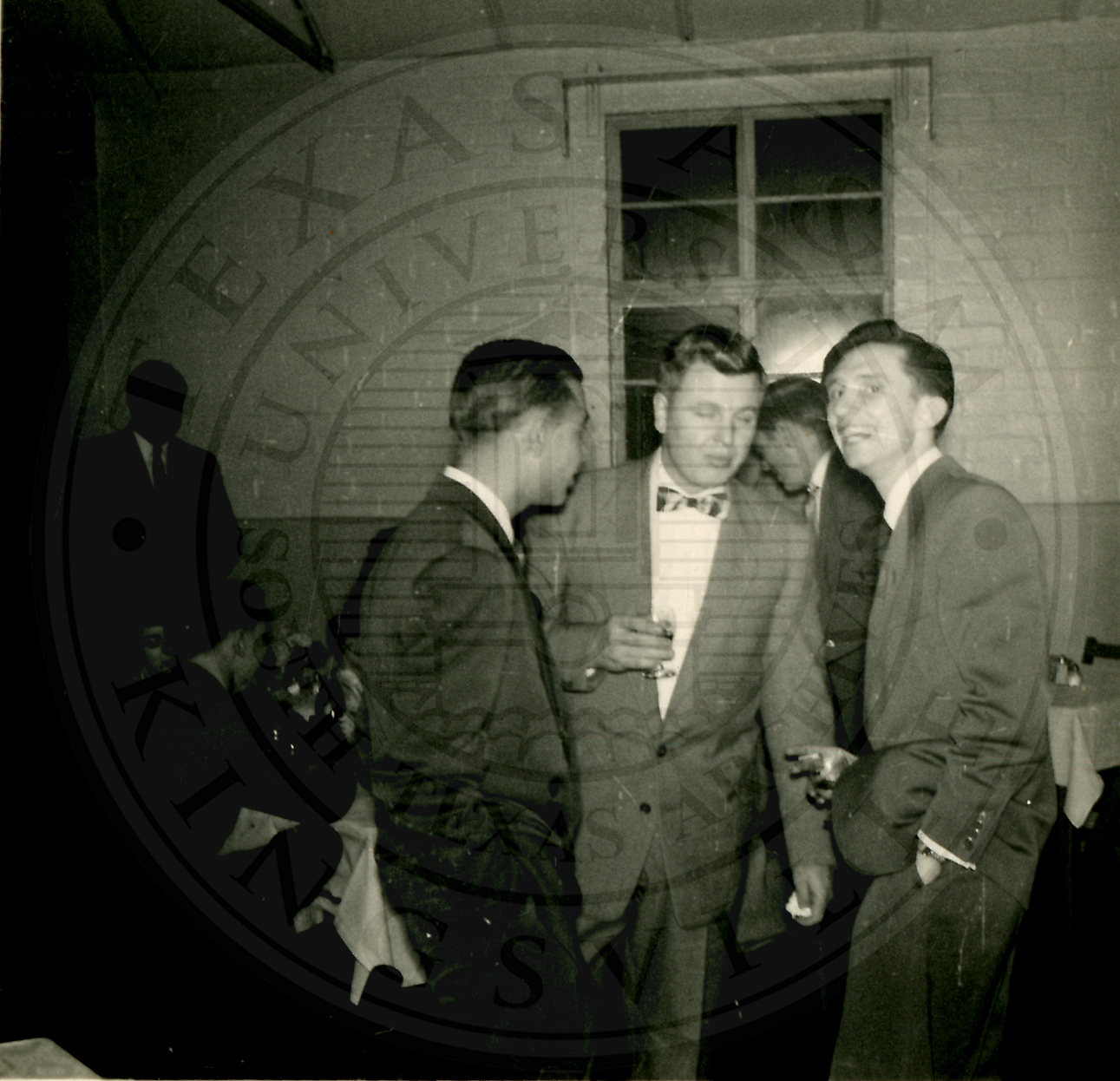 New Years Eve. Three unidentified men standing next to each other talking. The man on the left has his back to the camera |