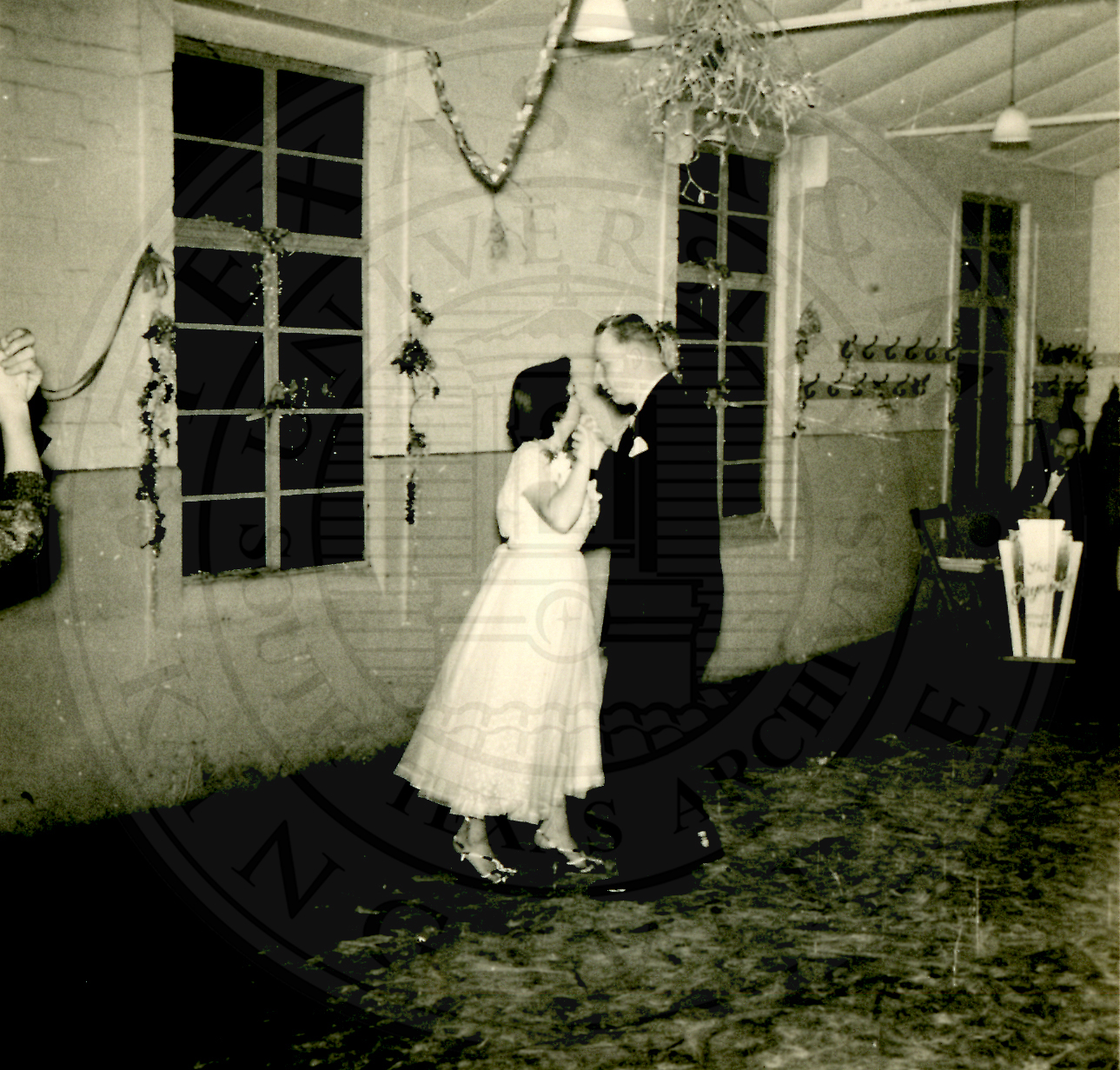 New Years Eve. Unidentified couple dancing by themselves on the dance floor. An unidentified man is seated next to a chair in the background |