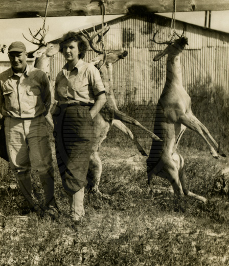 Photo of unknown man and woman with three dead deer