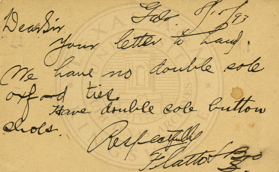 Dear Sir, Your letter to hand. Me have no double sole oxford ties. Have double sole button soles